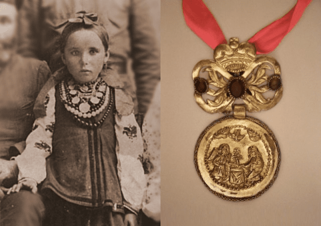 Такое же оформление могла иметь любая крупная серебряная русская или иностранная монета. Отдельная и самая простая форма полтавских дукачей – медаль с ушком, выполненная в технике литья из темной меди или светлой латуни как имитации золота. Ушко и ободок, имитирующий проволочное плетение, отливались вместе с медалью. Такие дукачи почти никогда не золотили и к бантам не прикрепляли.
