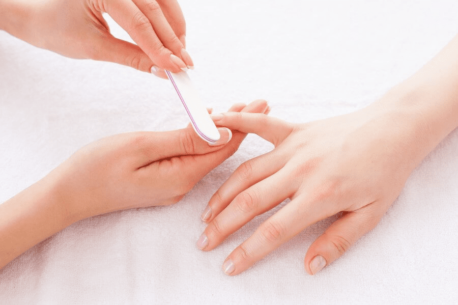 Використовуйте скляну, керамічну або дрібноабразивну пилочку (240 гріт і вище для натуральних нігтів). Металеві пилки можуть викликати розшарування. Підпилюйте нігті лише в одному напрямку, рухаючись від краю до центру. Уникайте хаотичних рухів туди-сюди. Надавайте нігтям бажаної форми (овал, м’який квадрат, мигдаль), але не спилюйте сильно бокові сторони, щоб не послабити нігтьову пластину. Підпилюйте лише сухі нігті.